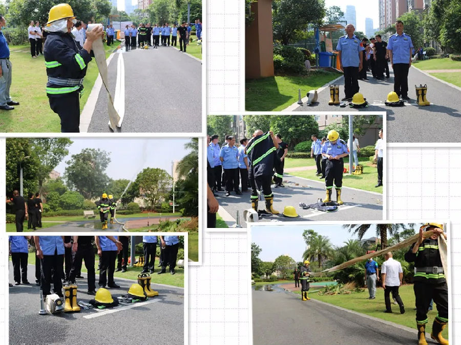 ▲來(lái)自君健物業(yè)各小區(qū)的安保人員正在比拼消防滅火護(hù)具穿戴與滅火步驟。